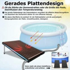 Die Poolheizung hat ein lineares Design, das die Sonnenenergie effizient nutzt und in kurzer Zeit Waerme aufnehmen und aufheizen kann. (Der Grad der Waermeaufnahme haengt von der Installationsmethode und der genutzten Flaeche ab)